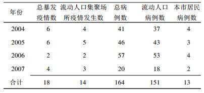 2 结果 2.1 虹口区传染病流行特征(表 1)| 表 1 虹口区2004-2007年疫情发生情况 |