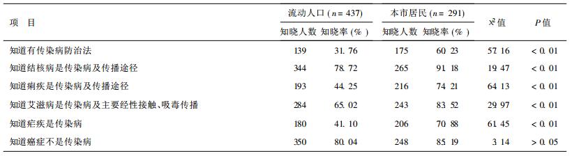 流动人口中,了解国家制定有传染病防治方面相关法律者占31.76%,了解途径主要是通过广播电视,与本市居民比较,差异有统计学意义(P < 0.01)。流动人口中,判断传染病与非传染病、相关传染病传播途径正确率明显低于本市居民,差异有统计学意义(P < 0.01);知道痢疾和疟疾属于传染病者占40%。