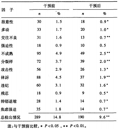 除强迫性外,干预前后行为问题各因子检出率和总检出率差异均有统计学意义(P < 0.05,P < 0.01)。