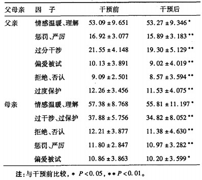3 讨论调查结果表明,中学生行为问题总检出率为14.8%,与国内调查结果基本一致〔4〕。经过为期1年的综合干预后,行为问题检出率降至9.6%,干预前后比较差异有统计学意义,提示通过综合干预,父母的教养方式有了明显改善,父母亲能够保持良好心态,表现出家长的大度和宽容,让子女在宽松的环境中充分发挥自己的潜能,能够与子女进行语言交流和情感的沟通,避免了因严厉、过分干涉等不良教养行为而引起新的行为问题。