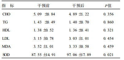 AMD患者血清CHO、TG、HDL、LDL水平和MDA含量在干预前后差异无统计学意义(P > 0.05);与干预前比较,LA干预后AMD患者血清SOD活性均明显升高,差异有统计学意义(P < 0.05)。