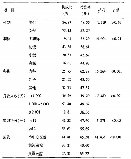 1.4 相关定义吸烟者为一生中连续或累计吸烟6个月或以上者, 其中现在吸烟者为符合吸烟者条件, 调查时正在吸烟者; 以是否劝告吸烟病人戒烟为应变量, 以调查对象的性别、年龄、医院工作年限、职称、学历、科室、月收入状况、医院禁止吸烟规定执行情况、吸烟相关知识等为自变量。