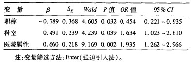 将所选的自变量全部进入方程分析, 二维Logistic回归分析结果显示, 影响医生劝告戒烟行为的主要因素为医院属性、职称和科别。