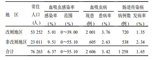 本次调查显示,在血吸虫病流行农村地区,改厕地区人群血吸虫感染率比非改厕地区人群低47.32%;改厕地区人群肠道传染发病率比非改厕地区人群低42.31%。