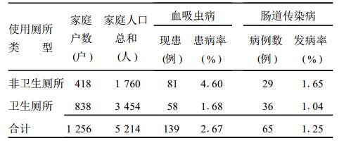 本次调查显示,使用卫生厕所人群血吸虫病患病率比使用非卫生厕所人群低63.5%;使用卫生厕所人群肠道传染病发病率比使用非卫生厕所人群低37.0%。
