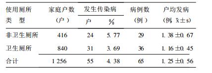 使用卫生厕所的家庭发生肠道传染病比使用非卫生厕所家庭低36.05%。2006年曾发生肠道传染病的家庭,使用卫生厕所家庭户平均发病人数为(1.16±0.45)人;使用非卫生厕所家庭户平均发病人数为(1.38±0.67)人,使用卫生厕所家庭低于使用非卫生厕所家庭。相对于使用非卫生厕所家庭,使用卫生厕所家庭发生肠道传染病家庭比例、家庭平均发病人数均低于使用非卫生厕所家庭,而且,发病的影响人群范围也较为稳定。