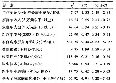 单因素分析表明, 工作单位类别、家庭年收入等10个因素差异有统计学意义。其中居民对家庭病床服务好处的认识是居民接受家庭病床服务最主要的影响因素。