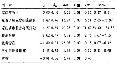 将单因素分析有意义的因素变量纳入多因素分析, 进行Logistic回归分析。有意义的变量因素共有家庭年收入、是否了解家庭病床服务、是否认为家庭病床服务有好处、收费标准、费用报销、医生的职业道德等6个因素。其中对居民接受家庭病床服务的影响最大的仍然是居民对家庭病床服务好处的认识, 其次是收费标准与是否了解家庭病床服务等因素。