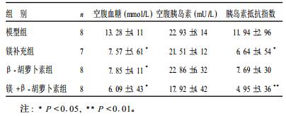 镁补充组、β-胡萝卜素和镁+β-胡萝卜素组血糖均较模型组大鼠分别降低4310%, 4017%(P < 0.05)和54.1%(P < 0.01);镁补充组HOMA-IR较模型组降低4414% (P < 0.05), 镁+β-胡萝卜素组降低58.5%(P < 0.01), 表明镁和β-胡萝卜素及联合补充均可以明显降低血糖, 镁可以明显改善胰岛素抵抗, 联合补充对改善胰岛素抵抗有协同作用。