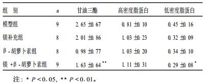 2.3 镁及β-胡萝卜素干预后各组大鼠血脂水平比较(表 2)| 表 2 镁及β-胡萝卜素干预后各组大鼠血脂水平比较( x±s, mmol/L) |