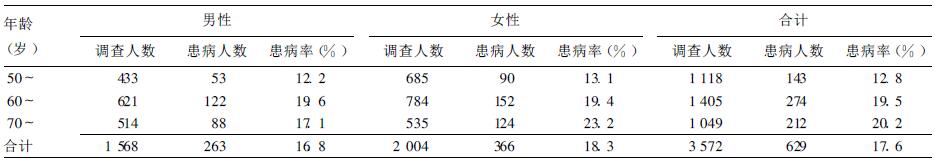 1 对象与方法 1.1 对象以天津市某社区50岁~且在本市居住5年~的全部居民共3 572人为调查对象, 其中男性1 568人, 女性2 004人。