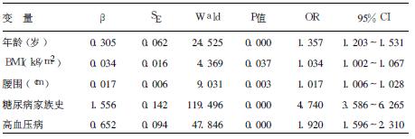 对单因素分析中差异有统计学意义的8个变量进行多因素非条件Logistic回归分析, 采用逐步引入法, 纳入回归方程的水准为0.05, 剔除水准为0.10, 最终进入回归模型的有年龄、BMI、腰围、糖尿病家族史、高血压病共5个因素。