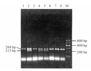 注:1,3,6,7,8:GSTM1(-)缺陷型;2,4,5:GSTM1(+)功能型;M:Marker。 图 1 GSTM1基因PCR扩增产物电泳圈 |