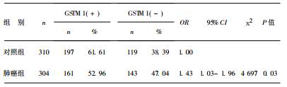 2.2 蒙古族人群GSTM1基因多态性与肺癌易感性关系(表 1)| 表 1 蒙古族人群GSTM1基因多态性与肺癌易感性的关系 |