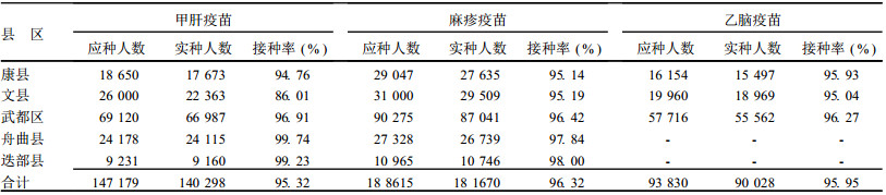 HepA调查接种率均在95%以上; JEV-1调查接种率最高为康县100%, 最低武都为84.93%;MV接种率均> 90%。
