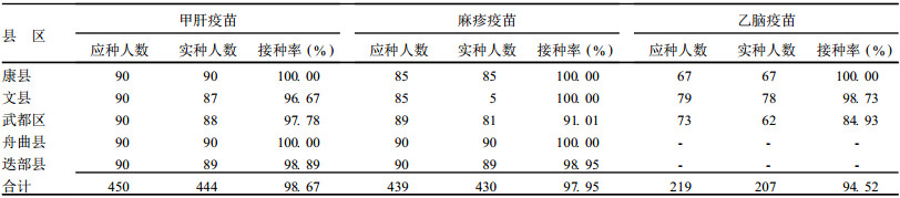 1.2 方法(1)甲肝灭活疫苗(HepA)、甲-乙肝联合疫苗(北京科兴生物制品有限公司); 批号为2008030604, 有效期为20110913。(2)流行性乙脑炎减毒活疫苗(JEV-1)(兰州生物制品研究所); 批号为20071001, 有效期为20090428。(3)麻疹减毒活疫苗(MV)批号为20070905/20071003, 有效期为20090411/20090501。(4)接种点设置:各级在利用原有接种点进行接种, 城镇原有行政区域划分的城镇、社区卫生服务站或地段医院及预防接种门诊开展接种工作; 农村在乡、村级接种点进行接种。同时深入到临时搭建的帐篷居民安置区开展接种。预防接种期间, 共设立1 154个接种点, 其中武都区462个, 文县105个, 康县528个, 舟曲县38个, 迭部县21个。(5)现场快速评估:评估方法为每个县随机抽取2个乡, 每个乡抽查1~3个村, 入户调查适龄儿童30名。同时每个县从市场、车站调查30名目标儿童。每个县共评估90名儿童。(6)数据资料:人口资料来源于2007年甘肃省人口年鉴; 接种率资料来源于甘肃省地震重灾区2市5个县区报告接种率报表; 现场快速评估资料来源于省、市、县评估报告。