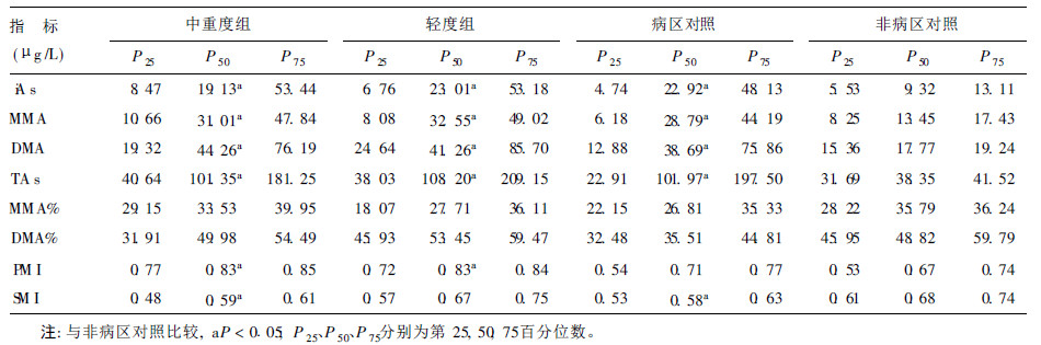 2 结 果 2.1 尿砷及甲基化水平( 表 1)| 表 1 不同人群尿砷形态与砷甲基化水平( 6例) |