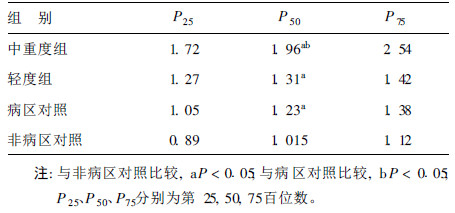 分析可见,中重度组,轻度 组,病区对照组人群尿iAs,MMA,DMA,TAs水平均明显高于 非病区对照组人群水平。中重度组、轻度组人群PM I水平明 显高于非病区对照组人群水平,而中重度组和病区对照组人 群SM I水平明显低于非病区对照组人群水平。