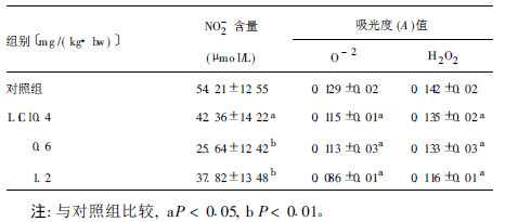表 2可 见,3种不同L iC l染毒剂量,对巨噬细胞生成NO能力都产 生抑制,与对照组比较差异均有统计学意义( P < 0.05) ,剂量 组之间比较,差异有统计学意义( P < 0.01)。同时对巨噬细 胞产生O-2的能力产生抑制,与对照组比较差异有统计学意 义,且随剂量的增高,O-2产生逐渐下降( P < 0.05 )。11 2 mg /( kg· bw )对巨噬细胞产生的H2O2 出现明显抑制,与对照 组比较差异有统计学意义。而0.4,0.6 m g / ( kg· bw ) 组的 L iC l未见明显抑制,但随剂量的增高,H2O2 产生的量逐渐减 少( P < 0.01) 。