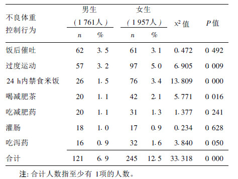 大学生不良体重控制行为总报告率为9.8%,女生报告率为12.5%,明显高于男生的6.9%(χ2=33.318,P < 0.01)。男女生常用的不良体重控制行为方式存在一定差异,其中女生报告过度运动、24 h内禁食米饭、喝减肥茶3种行为发生率高于男生,差异均有统计学意义(P < 0.05);男生饭后催吐的报告率高于女生,但差异无统计学意义(P > 0.05)。