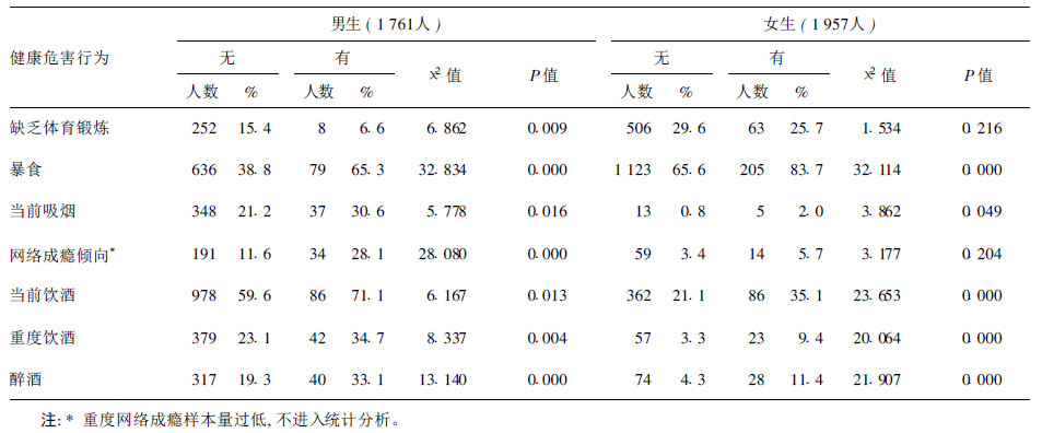 有不良体重控制行为的男生和女生与无不良体重控制行为者比较,暴食、当前吸烟、当前饮酒、重度饮酒、醉酒、网络成瘾倾向等的报告率均较高;除女生的网络成瘾倾向外,其他行为报告率差异均有统计学意义(P < 0.05);其中女生除暴食的报告率高于男生外,其他健康危害行为报告率均低于男生,而缺乏体育锻炼则表现为相反的趋势,即有不良体重控制行为的学生缺乏体育锻炼的报告率低于无不良体重控制行为的学生,且男生间差异有统计学意义(P < 0.05)。