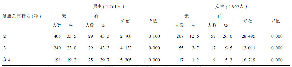 有不良体重控制行为的男生和女生中2,3,≥4种健康危害行为并存的报告率高于无不良体重控制行为人群,除男生2种健康危害行为并存报告率外,其他差异有统计学意义(P < 0.05)。