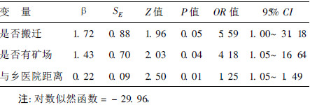 以是否补硒、是否搬迁、是否改水、是 否有矿场、年人均收入、与乡医院距离、与县医院距离、地形8 个变量进行多因素条件Logistic回归分析,采用逐步后退法, 剔除和入选变量标准分别为0.15和0.14。最后进入模型的 有3个变量,分别为是否搬迁、是否有矿场和与乡医院距离。