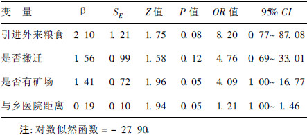 以是否补硒、是否搬迁、是否改水、是 否有矿场、年人均收入、与乡医院距离、与县医院距离、是否引 进粮食8个变量进行多因素条件Logistic回归分析,采用逐步 后退法,剔除和入选变量标准分别为0.15和0.14。最后进 入模型的变量是引进外来粮食、是否搬迁、是否有矿场和与乡 医院距离,均为危险因素。虽然2个模型的对数似然函数相 近,但模型2变量的标准误比较大,OR值可信区间较宽。另 外,结合流行病学专业知识,模型1的3个变量从不同角度反 映出自然村所处的地理位置以及环境状况,而模型2的2个 变量之间存在一定矛盾,引进外来粮食显示危险来自外村,然 而外村没有发病;是否有矿场则说明危险存在于该村周围。 因此,选择模型1作为该研究的最后结果。