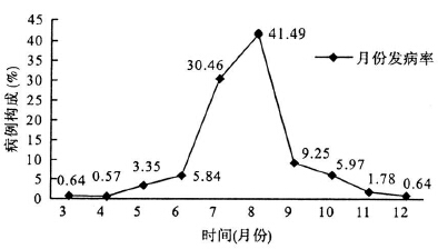 2.3 季节分布(图 1)2001-2008年钩体病发病呈明显的季节性,除了1-2月无病例报告外,其他月份均有病例发生,3-5月病例较少,6月份病例开始增加,7-8月维持在较高水平,占总病例数的71.96%(1 011/1 405),8月是发病高峰,9月病例数逐渐下降,全省钩体病病例呈单峰季节分布形式。