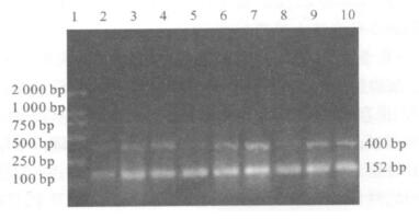 注: 1: DNA marker; 2: 0 mmol/L 3 d; 3: 1.8 mmol/L 3 d; 4: 3.3 mmol/L 3 d; 5: 0mmol/L 3个月; 6: 1.8 mmol/L 3个月; 7: 3.3 mmol/L 3个月; 8: 0 mmol/L 6 个月; 9: 1.8 mmol/L 6 个月; 10: 3.3 mmol/L 6个月。 图 1 IP6 对HT-29细胞Caspase-3 mRNA表达影响 |