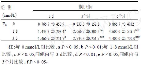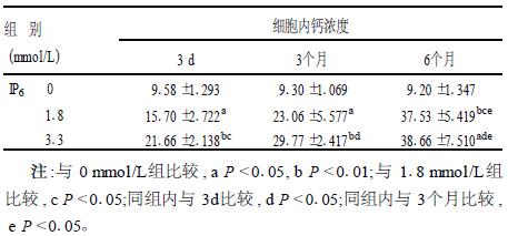 各IP6作用组 Ca2+浓度均升高(P < 0.05),其中IP6以3.3 mmol/L作用3 d,3,6个月后,Ca2+浓度随作用时间的延长而升高,差异有统计学意义(P < 0.05)。