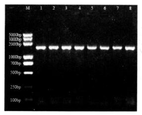 注:M: DNA Marker; 1 ~8: 热带假丝酵母菌42, 65, 58816, 59409, 58025, 58841, 53136和236菌株。 图 1 CtERG11基因PCR扩增电泳图 |