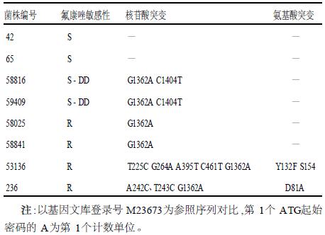1.3.4 PCR产物测序及DNA序列分析PCR产物纯化后测序,利用BioEdit软件及基因序列数据库BLAST程序将热带假丝酵母菌临床分离株(耐药株4株、S-DD株2株和敏感株 2株)的CtERG11基因序列与氟康唑敏感标准株ATCC 750 序列进行比对和分析。