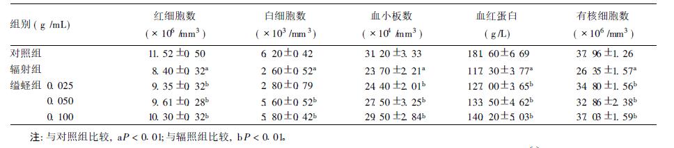 材料与方法(1)试剂与仪器:缢蛏(乐清清江养殖场),将缢蛏置于真空干燥箱内干燥后机械化粉碎,贮藏于低温环境(-20℃)中,每次灌胃前将缢蛏配制成悬浮液使用。血红蛋白测定试剂盒(上海科欣生物技术研究所),批号为20050201。60Co-γ射线源(温州市第二人民医院)。(2)实验动物:清洁级ICR雄性小白鼠(温州医学院实验动物中心)50只,雄性,体重22~32g,鼠龄6~7周。食用混合颗粒饲料。(3)分组及处理:将小鼠随机分成5组,每组10只。分别为正常对照组、60Co-γ辐照组和低、中、高缢蛏组(0.025,0.05,0.1mL)。辐照组和缢蛏组用60Co-γ射线一次性全身照射,总剂量为5.0Gy,距离75cm,照射率0.656Gy/min。对照与辐照组灌胃给予生理盐水0.1mL/只;低、中、高缢蛏组分别给予0.025,0.05和0.1g/mL缢蛏悬浮液;每天灌胃1次连续10d。(4)测定体质:红细胞数、白细胞数及血小板数测定按文献〔5〕;有核细胞测定按文献〔6〕进行。血红蛋白测定按试剂盒说明。(5)统计分析:采用SPSS10.0统计软件进行方差分析。
