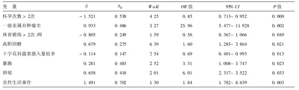 2.2 浆液性卵巢癌发病相关影响因素 2.2.1 单因素Logistic回归分析单因素Logistic回归分析结果显示,怀孕次数>2次(OR=0.77)、一级亲属肿瘤史(OR=27.33)、婚姻次数>2次(OR=1.77)、体育锻炼>2次/周(OR=0.58)、高胆固醇(OR=1.59)、十字花科蔬菜摄入量较多(OR=0.70)、暴躁(OR=3.02)、抑郁(OR=5.75)、心情开朗(OR=6.62)和负性生活事件(OR=1.59)是浆液性卵巢癌发病的相关影响因素。