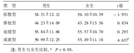 男生成就型同一性得分明显高于女生,差异有统计学意义(P < 0.01)。不同类型同一性得分在城乡间差异均无统计学意义(P >0.05)。