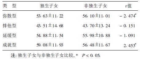 独生子女成就型同一性得分明显高于非独生子女(P < 0.05),而弥散型同一性得分明显低于非独生子女(P < 0.05)。