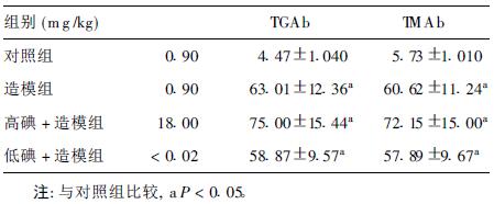 与对照组比较,甲状腺球蛋白抗体(TGAb)及甲状腺微粒体抗体 (TMAb)在造模组、高碘+造模组、低碘+造模组明显升高(P < 0.05)。