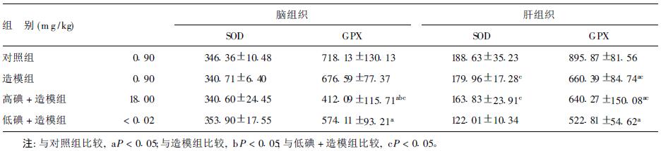 与对照组相比,造模组大鼠肝组织GPX活性明显降低(P < 0.05)。与造模组相比高碘+造模组大鼠脑组织GPX活性下降最为明显(P < 0.05)。在造模组中,低碘+造模组大鼠肝组织GPX和SOD活性最低(P < 0.01)。