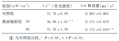 30 mW/cm2微波辐射后突触体内Ca2+浓度为(36.96 ± 1.01),与对照组比较明显升高(P < 0.01),表明突触体Ca2+发生内流;而50 mW/cm2微波辐射后Ca2+浓度与对照组比较差异无统计学意义(P > 0.05)。30和50 mW/cm2微波辐射后大脑皮质突触体乙酰胆碱释放均明显增加(P < 0.01),显示微波辐射后乙酰胆碱代谢活跃。