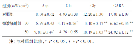 30 mW/cm2微波辐射后大脑皮质突触体Glu、Gly和GABA释放均明显减少(P < 0.05或P < 0.01);50 mW/cm2微波辐射后大脑皮质突触体 Asp、Gly和GABA释放均明显增加(P < 0.05或P < 0.01)。表明微波辐射后30 mW/cm2组以递质释放减少为主,50 mW/cm2组以递质释放增加为主。