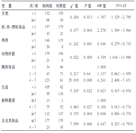 根据当地居民的饮食特点,将不同食品的食用频次分成不同的等级,比较病例组和对照组的 饮食习惯。结果显示,10年前腌制食品、贝类、煎、炸、烤制食 品、鸡肉、生蒜、新鲜蔬菜、豆类及其制品、动物肝脏食用频次 等方面差异有统计学意义;而10年前的猪肉、牛羊肉、鱼类食 用频次、吃菜及吃肉习惯方面差异无统计学意义。