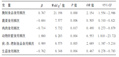 将单因素分析差异有统计学意义 的因素代入条件Logistic回归模型,采用Backward:LR法进 行多因素分析。结果显示,10年前较多食用腌制食品、动物 肝脏、煎、炸、烤制食品为大肠癌的相关危险因素;而10年前 较多食用新鲜蔬菜、鸡肉、生蒜为大肠癌的相关保护因素。