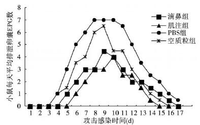 用微小隐孢子虫卵囊攻击感染后17 d中,肌注组及滴鼻组小鼠平均每克粪便中卵囊数(EPG)始终低于对照组和空质粒组,并且初始排卵囊时间延长至感染后第4~6 d,卵囊持续排出时间仅持续9~ 14 d。与对照组及空质粒组比较,卵囊排泄数量减少了 40%~60%,初始排卵囊时间延迟2 d;卵囊持续排出时间缩短5 d,差异均有统计学意义(F=3.6,P < 0.05)。肌注组和滴鼻组间差异无统计学意义(P > 0.05)。