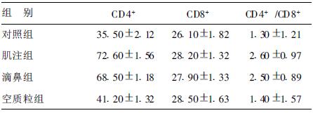 第3次免疫后2周,肌注组与滴鼻组小鼠脾细胞CD4+、CD4+/CD8+比值明显高于对照组及空质粒组(P < 0.05),但肌注组与滴鼻组差异,以及各组间CD8+T细胞差异均无统计学意义(P > 0.05)。