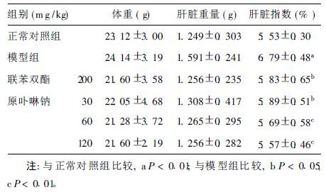 结果表明,各组小鼠体重差异无统计学意义(P > 0.05)。与正常对照组比较,模型组肝脏指数明显增加(P < 0.01);与模型组比较,联苯双酯组、原卟啉钠低、中、高剂量组肝脏指数降低,差异有统计学意义(P < 0.05或P < 0.01)。