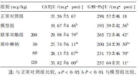 与正常对照组比较,模型组小鼠肝脏CAT、GSH-Px活力明显降低(P < 0.01);联苯双酯、原卟啉钠低、中、高剂量组肝脏CAT活力明显升高,差异有统计学意义(P < 0.05或P < 0.01);联苯双酯和原卟啉钠高剂量组肝脏GSH-Px活力明显高于模型组,差异有统计学意义(P < 0.05)。