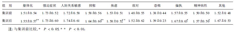 新兵经3个月集训期后,SCL-90各因子分均有所增加,其中焦虑、抑郁、精神病性、躯体化和偏执的因子分差异有统计学意义(P < 0.05或P < 0.01)。