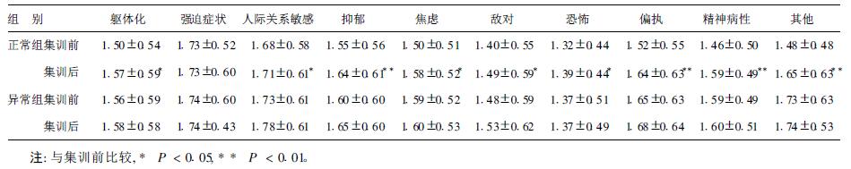 正常组276名新兵经过集训后,SCL总分> 170分有76人,占 27.54%;SAS总分≥43分有31人,占11.24%;SDS总分≥48分有19人,占6.89%。正常组新兵除强迫因子前后差异无统计学意义,其他各因子前后差异均有统计学意义(P < 0.05或 P < 0.01)。异常组中除强迫和恐怖因子分,其他各因子分均有所增高,但前后差异均无统计学意义(P > 0.05)。