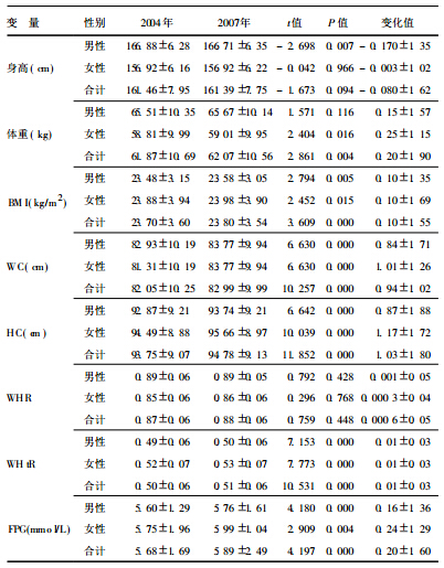 2004-2007年,总随访人群身高和WHR无明显变化,而体重、BMI、WC、HC、WHtR和FPG值均明显增加。按性别分层,男性体重、女性身高和男女性WHR3年变化差异无统计学意义;男性身高明显降低,其余项目在男女之间均明显增加。
